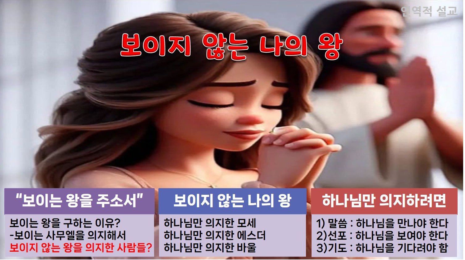 오늘 말씀에서 이스라엘 백성들은 제사장 사무엘에게 왕을 세워달라고 부탁하고 있습니다. 그 이유는 사무엘이 나이 많아 다스릴 수 없었기 때문이고, 사무엘의 두 아들 요엘과 아비야가 판결을 잘못했기 때문이며, 하나님에 대한 믿음이 없었기 때문입니다. 이 모든 것의 원인은 사무엘이었습니다. 사무엘은 두 아들과 백성들에게 하나님을 보여주어야 하는 사명이 있었는데, 그것에 소홀했기 때문입니다. 그래서 두 아들은 하나님이 아닌 사무엘 눈치만 보다가 실패했고, 이스라엘 백성들은 사무엘이 나이가 들자 눈에 보이는 다른 왕을 요구하기에 이른 것입니다. 사람들은 크고 화려하고 대단한, 보이는 왕을 따릅니다. 그러나 하나님은 눈에 보이시지 않는 왕이십니다. 성도는 보이지 않는 왕을 보여주는 사람들입니다. 어떻게 하면 보이지 않는 하나님을 보여줄 수 있을까요?