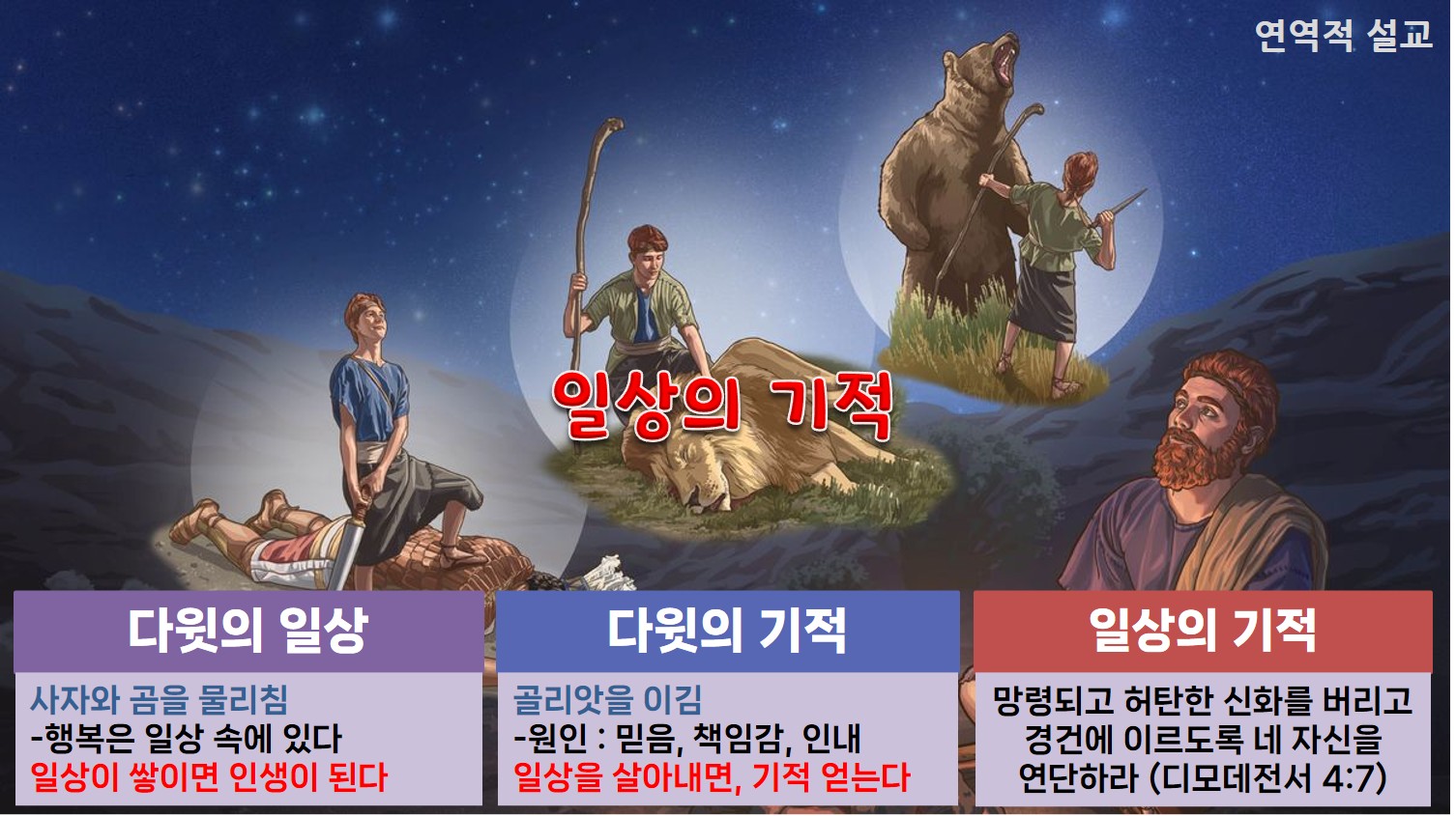 오늘 본문은 다윗이 골리앗을 물리친 이야기입니다. 골리앗은 하나님이 기적으로 이기게 하신 것이 아닙니다. 다윗이 평소 양을 치면서 사자, 곰과 싸워 이긴 경험 때문입니다. 즉, 다윗의 기적은 일상에 있었던 것입니다. 네잎 클로버의 꽃말은 “행운”이지만, 세잎 클로버의 꽃말은 “행복”인 이유는 행복은 우리 가까이, 일상 속에 있다는 뜻입니다. 행운은 삶을 빛나게 하지만, 행복은 삶을 아름답게 합니다. 그리고 일상이 쌓이면 인생이 됩니다. 행운보다 행복한 삶을 살아 행복한 인생을 만들려면 어떻게 해야 할까요?