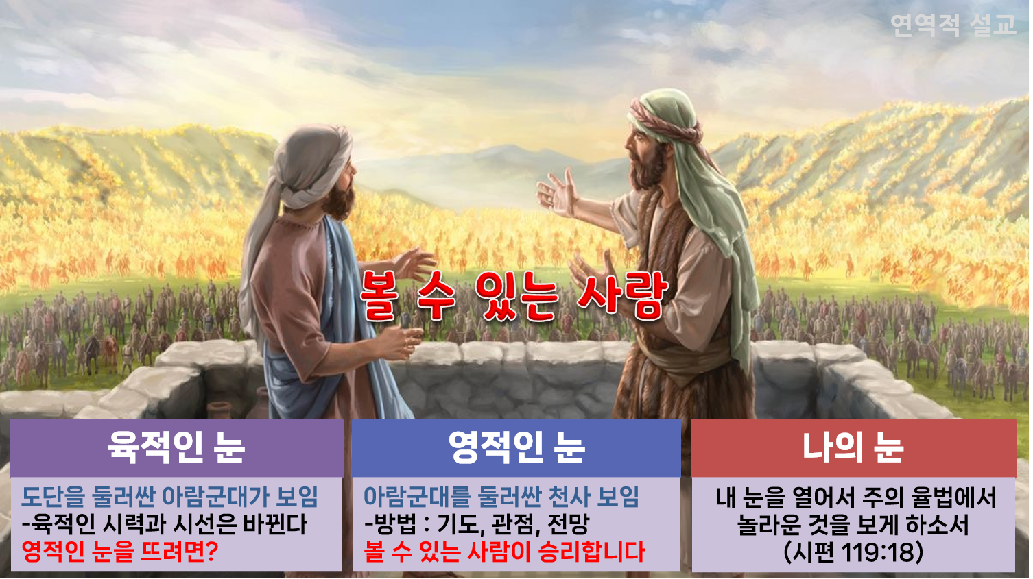 엘리사는 아람군대를 보고 놀란 게하시의 영적인 눈을 뜨게 해 주어, 그 뒤를 둘러싸고 있는 하나님의 불말과 불병거를 보게 해 줍니다. 그 이후 게하시는 두려워하지 않게 되었습니다. 그렇다면 게하시는 어떻게 영적인 눈을 뜨게 되었을까요? 첫 번째는 엘리사가 기도하여 게하시의 영적인 눈을 뜨게 해 주었습니다. 난파당한 배에 276명 중에 바울이 유일하276명 중에 바울이 유일하게 두려워하지 않았던 이유는 하나님이 바울의 영적인 눈을 뜨게 해 주셨기 때문입니다. 두 번째는 게하시는 엘리사가 보는 관점으로 바깥을 바라보니 영적인 눈이 띄이게 되었습니다. 영적인 눈은 사람의 관점이 아닌 하나님의 관점에서 보려고 노력할 때 열립니다. 세 번째는 게하시가 가까운 것만 보지 않고 먼 곳을 조망하였을 때 불말과 불병거를 보게 되었습니다. 영적인 눈은 가까이 있고 짧은 시간 속에 있는 것만을 보지 않고, 멀리 있고 먼 시간의 것을 보려고 할 때 열리는 것입니다.