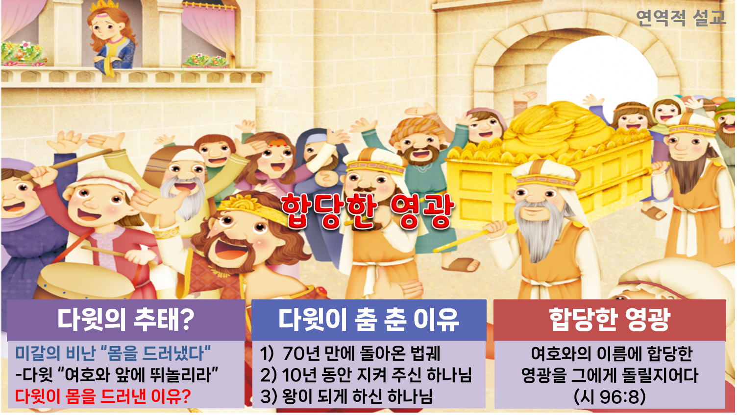 다윗이 옷이 벗겨지면서까지 춤을 춘 이유는 3가지입니다. 하나님이 임재하시는 법궤가 70여년 만에 이스라엘로 돌아왔기 때문입니다. 엘리 제사장의 두 아들 홉니와 비느하스는 법궤를 앞세워 싸우다가 블레셋에게 법궤를 빼앗기고 맙니다. 그 이후 블레셋에 7개월, 아비나답의 집에 70년, 오벧에돔의 집에 3개월 해서 70여년만에 드디어 법궤가 돌아오게 되어 기뻐 춤 춘 것입니다. 둘째는 다윗이 골리앗을 물리치고, 이스라엘의 장군이 되었으며, 사울왕을 피해 10년간 도망 다닐 때, 다윗을 떠나지 않고 돌봐주신 분떠나지 않고 돌봐주신 분이 하나님이시기 때문입닌다. 셋째는 사울왕이 죽은 후 유다의 왕을 거쳐 전체 이스라엘의 왕이 되도록 도와주신 분이 하나님이시기 때문입니다. 이처럼 다윗은 분명한 하나님의 은혜를 맛 보았기 때문에 춤추지 않을 수 없었던 것입니다.