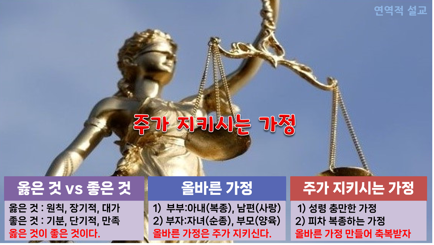 오늘 말씀에 ”자녀들아 주 안에서 너희 부모에게 순종하라 이것이 옳으니라“는 말씀이 있습니다. 자녀가 부모에게 순종해야 하는 것은 옳기 때문입니다. 옛말에 ”좋은 것이 좋은 것이다“라는 말이 있습니다. 그러나 이 말의 속 뜻은, 좋은 것만 쫓으면 안된다는 뜻입니다. 그렇다면 옳은 것과 좋은 것의 차이는 무엇일까요? [옳은 것]은 객관적 원칙일 지켜, 당장에는 손해가 있지만, 장기적으로는 이익을 얻는 것입니다. 그런데 [좋은 것]은 주관적인 가치를 우선하여, 당장에는 유익이 있지만, 점점 예상치 못한 문제가 생겨, 장기적으로는 불안과 손해가 예상되는 것입니다. 옳은 것은 힘들지만 지킬 때 반드시 상을 받게 되는 것입니다. 과거의 가정은 아버지, 어머니, 자녀가 각자의 옳음을 실천하는 생산적이고 발전하는 공동체였습니다. 하지만 현대의 가정은 각자의 좋음을 선택하여 정체되고 불안한 공동체가 되고 말았습니다. 그렇다면 올바른 가정을 만들기 위해 지켜야 할 원칙은 무엇일까요?