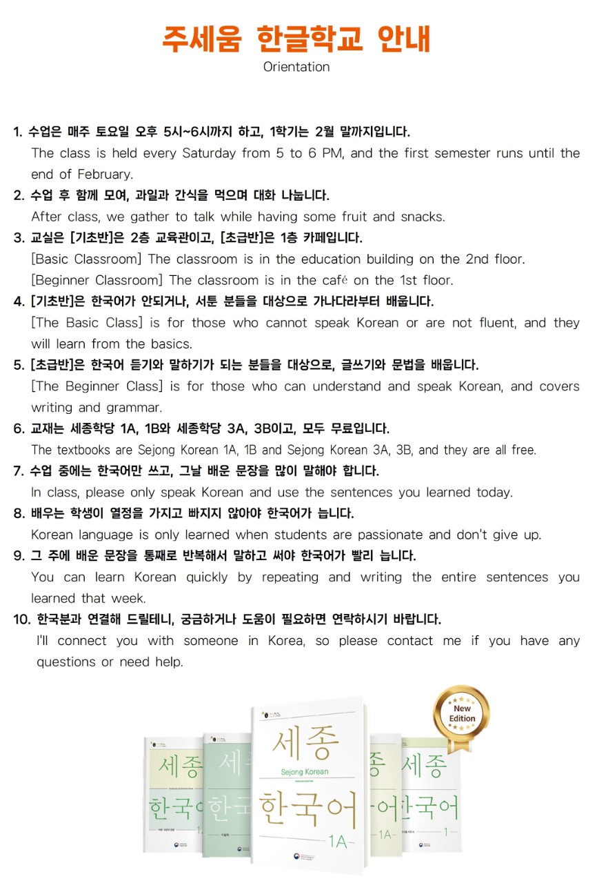한국어 교실 오리엔테이션 너무 잘했습니다. 나이지리아, 폴란드, 방글라데시 분들이 오셔서 레벨 테스트하시고, 많은 대화를 나누고, 간식을 드시고 가셨습니다. 오늘 못 오신 네팔, 베트남, 태국 분들은 10월 25일 개강일에 오실 겁니다. 그렇게 하면 최소 10명, 많으면 20명까지 모일 것 같습니다. 옆에 사는 사조의 집 문이 고장이 났는데 장로님께서 고쳐 주셨습니다 힘들지만 포기하지 않으니까 하나님의 사람을 붙여 주시네요^^ 앞으로도 포기하지 않고 열심히 해서 하나님의 사랑을 전하는 이주민 사역자반이 됐으면 좋겠습니다~