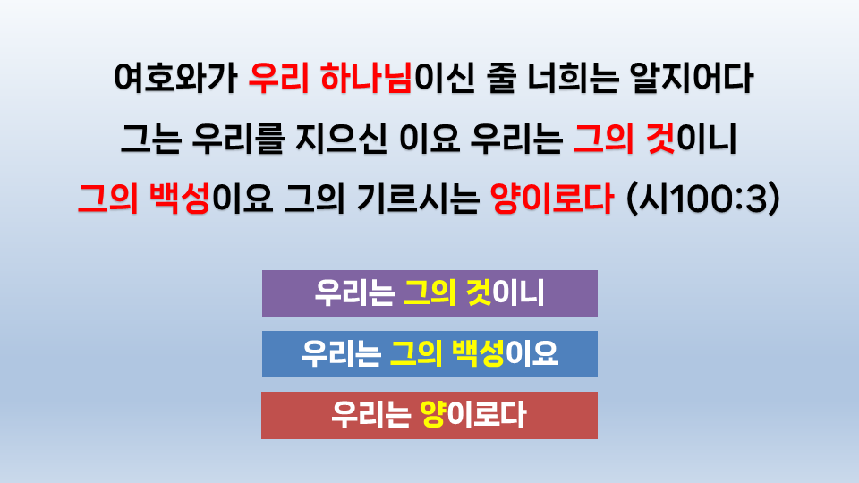 여호와가 우리 하나님이신 줄 너희는 알지어다 그는 우리를 지으신 이요 우리는 그의 것이니 그의 백성이요 그의 기르시는 양이로다
