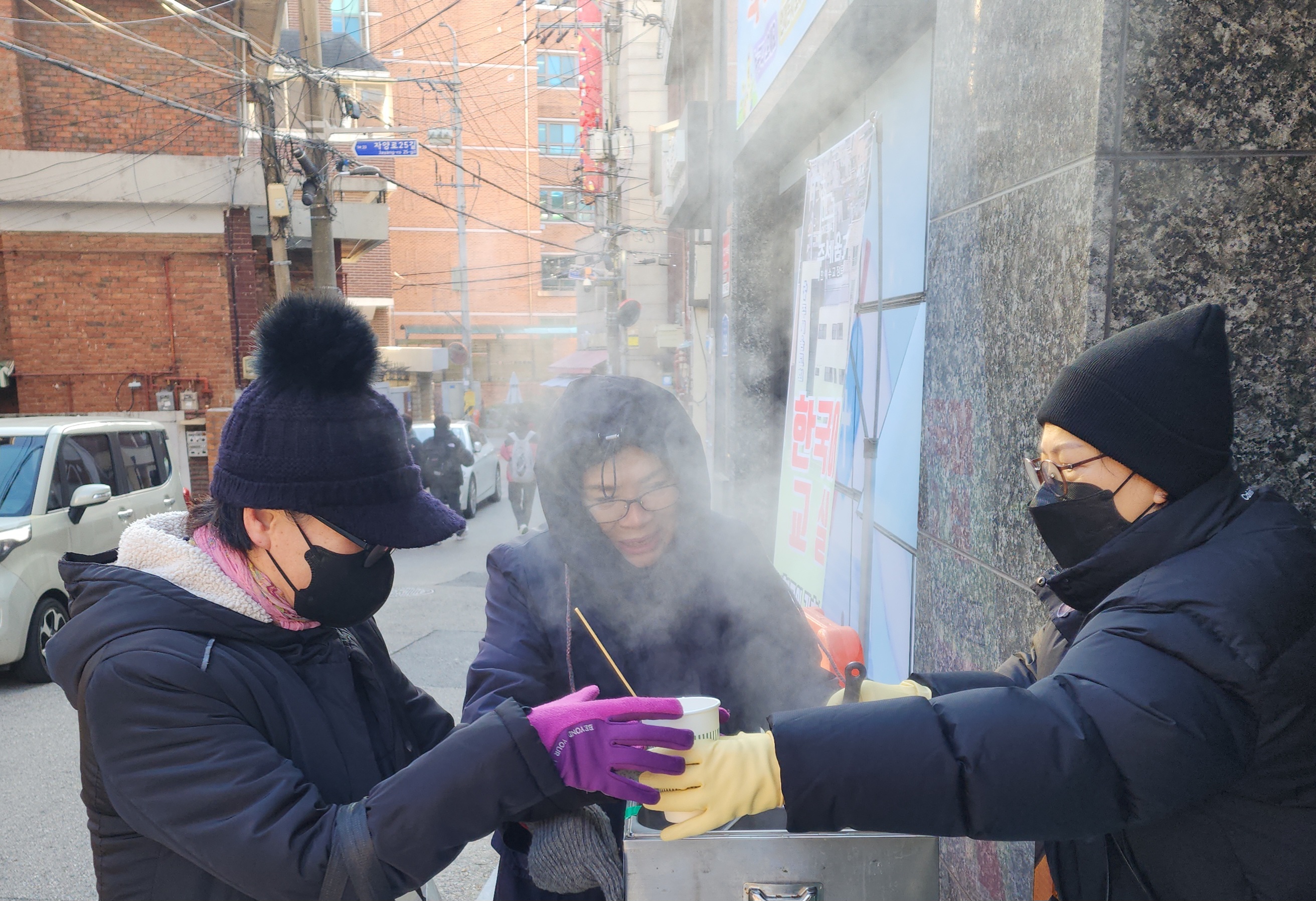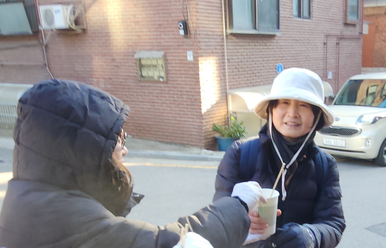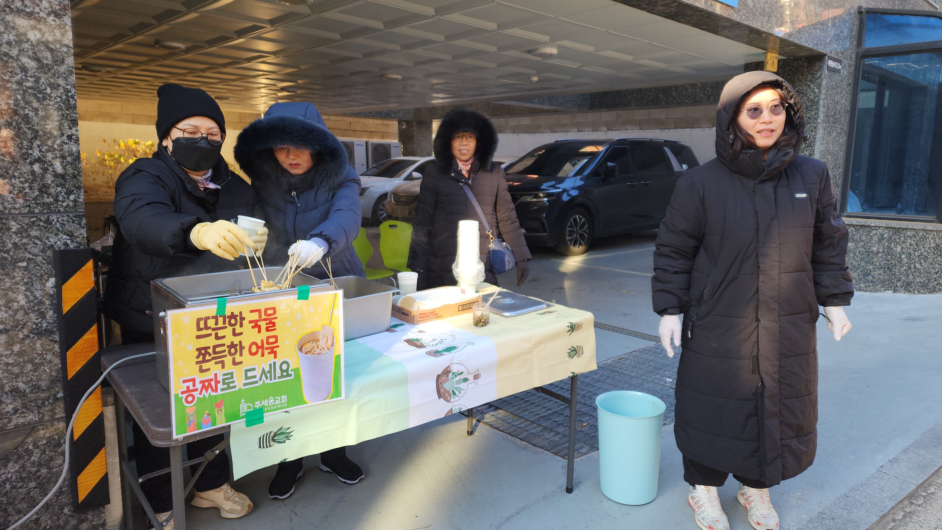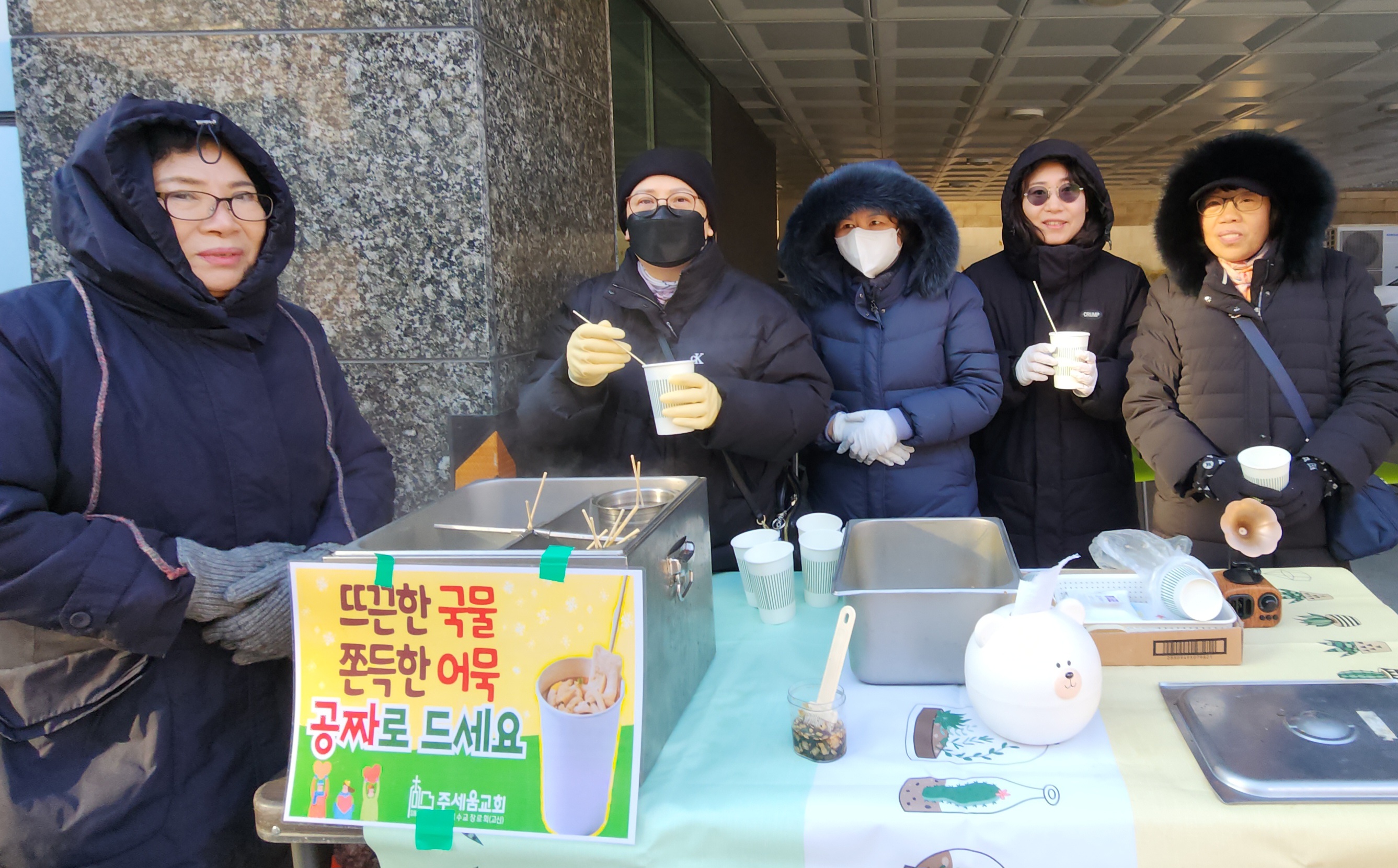 수요전도 33주차 잘했어요. 영하 4도, 체감온도 영하 9도의 날씨에 어묵이 최고로 인기 있었습니다. 지나가는 분들 거의 다 받아 가시고, 너무들 고마워하셨습니다. 필요한 것을 나누어 줄 수 있어서 너무 행복하네요. 어묵과 어묵국물에 담긴 그리스도의 사랑이 받아 가신 모든 분들의 마음속에 자리 잡기를 기도합니다. 오늘도 추운 날 나와서 수고하신 모든 분들께 감사드립니다.
