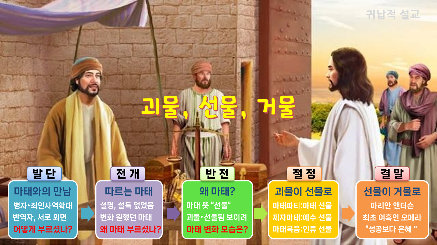 마태는 ”한 마리 양이 99마리 양보다 귀하다“(마 18:13)는 말씀속한 마리 양이 자신이었음을 떠올리며 감동했을 것입니다. 예수님이 괴물 마태를 변화시켜 선물과 거물이 되게 한 것 처럼, 힘든 사람을 사랑하여 모든사람을사랑하시길바랍니다
